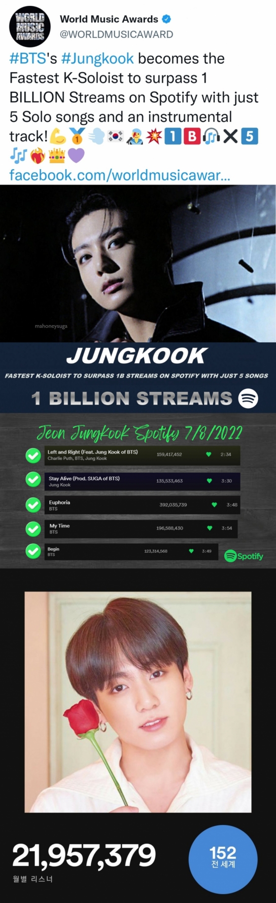 유럽의 빌보드라고 불리는 월드 뮤직 어워드(WMA)는 최근 정국이 세계 최대 음원 플랫폼 스포티파이(Spotify)에서 10억 스트리밍을 돌파했다며 공식 계정을 통해 집중 조명했다.