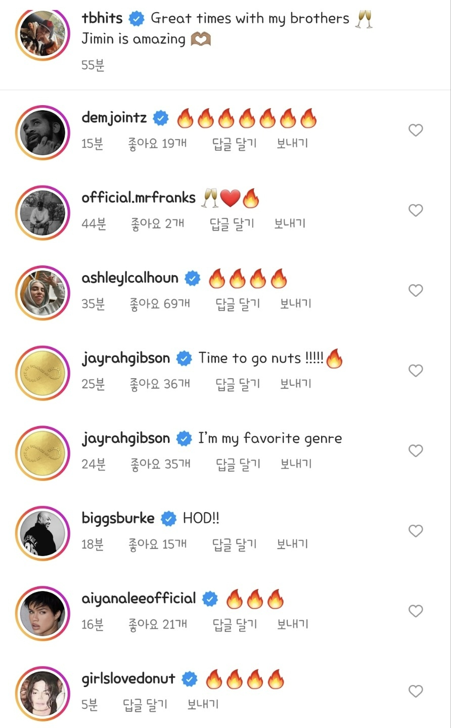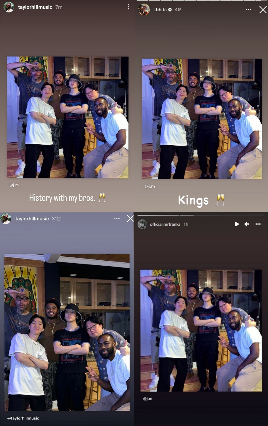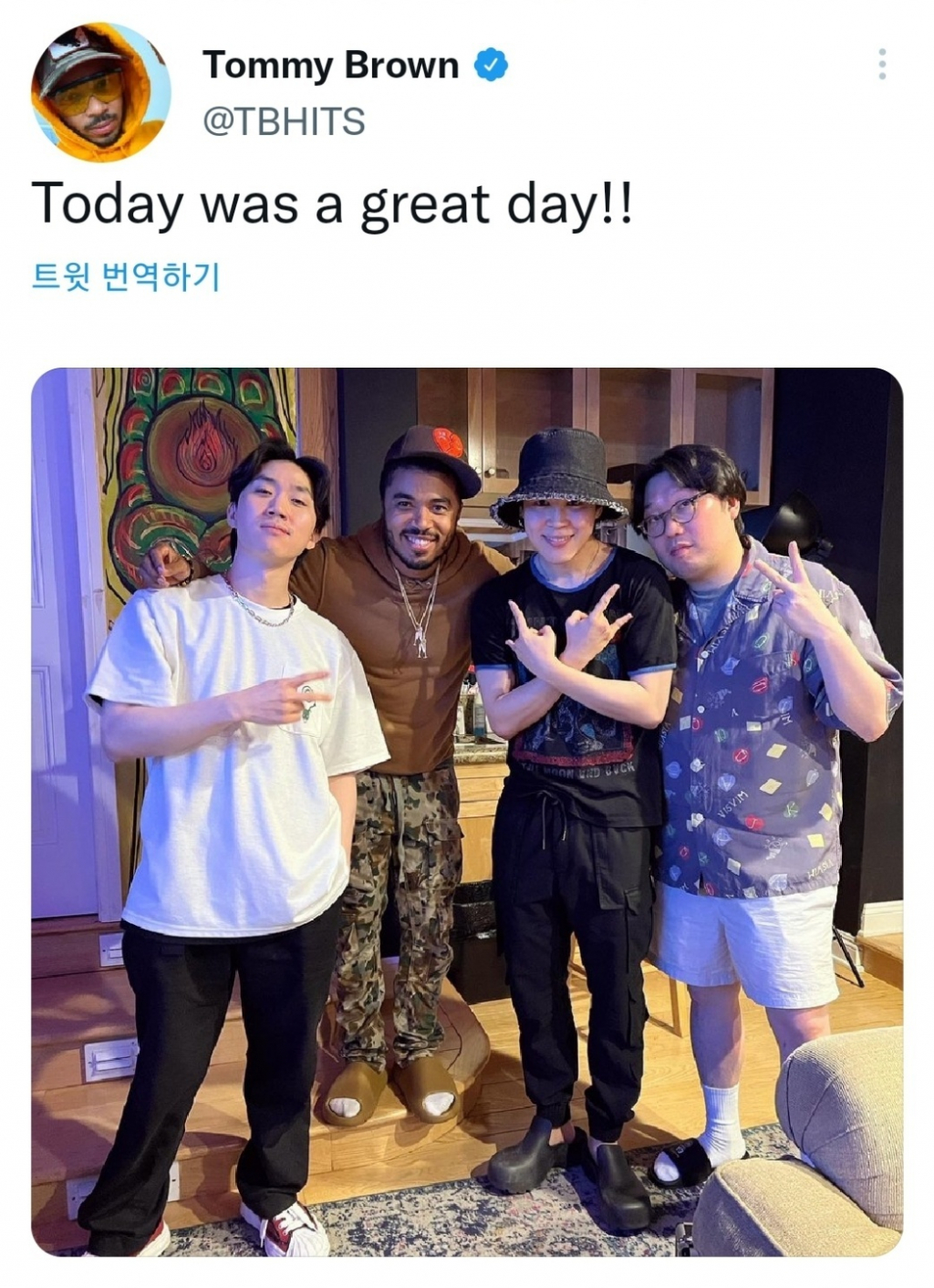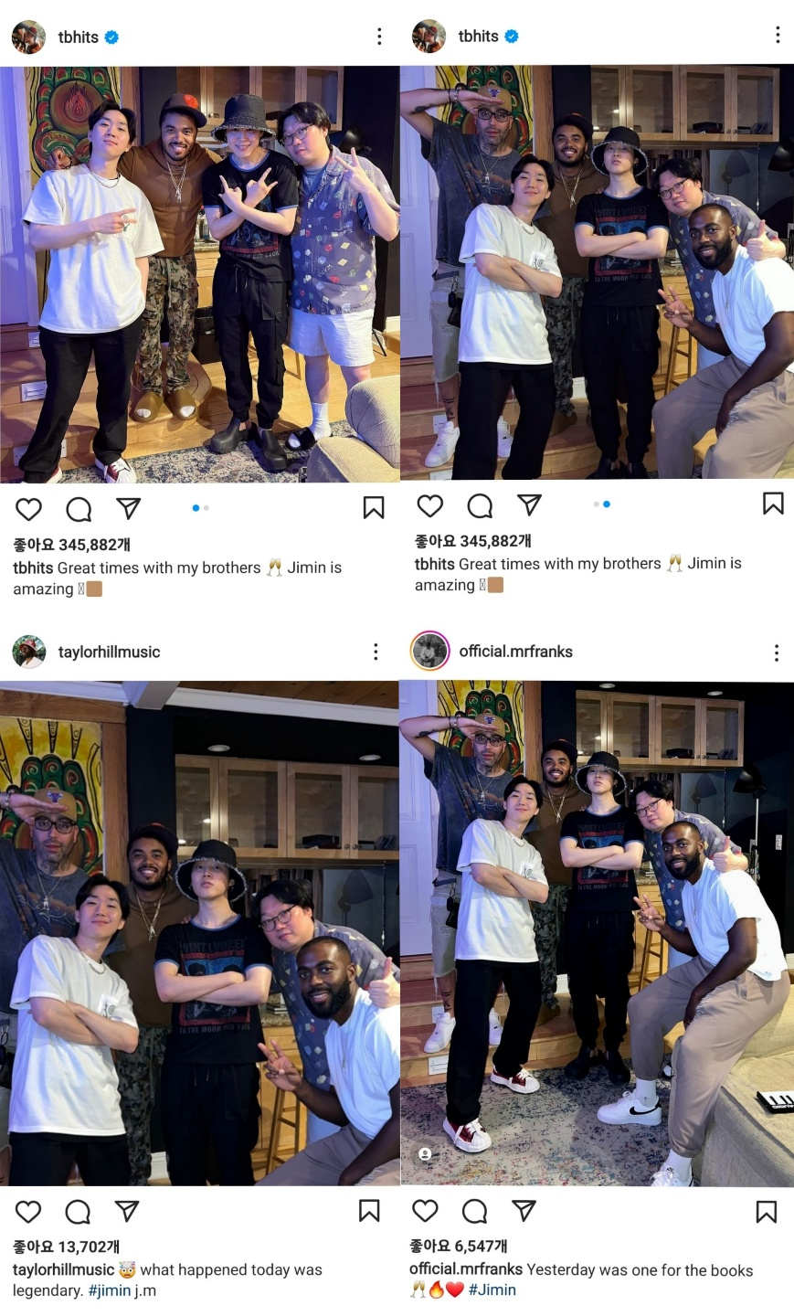 미국에 머물고 있는 지민은 최근 개인 인스타그램에 래퍼이자 프로듀서 토미 브라운 등 미국 유명 음악 프로듀서들과 함께한 사진을 공개했다.