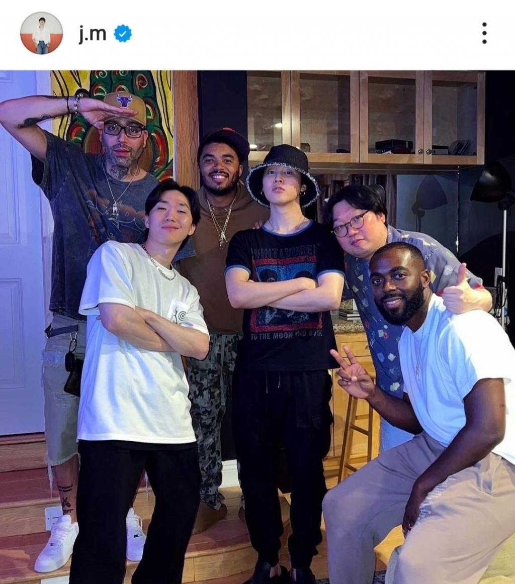 공개된 사진엔 올블랙 착장에 버킷햇을 쓰고 세련되면서도 편안한 착장을 한 지민을 중심으로 하이브와 미국 음악 프로듀서들이 지민을 둘러싸고 있는 모습이다.