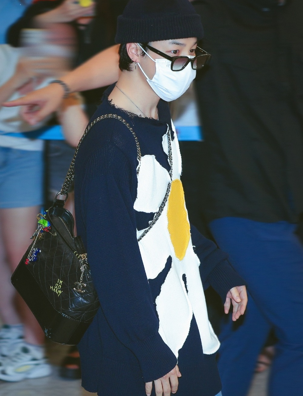 심플한 비니와 안경으로 스타일리쉬한 분위기를 뽐내며, 포근한 느낌의 데이지 꽃 모양이 중앙에 크게 배치된 니트와 루즈핏의 청바지를 매치해 귀여우면서도 세련된 공항 패션을 연출했다.