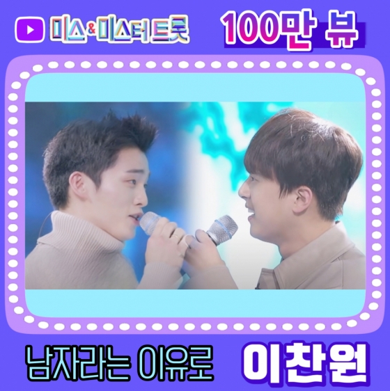 가수 이찬원의 진한 트로트 감성이 빛나는 '남자라는 이유로' 영상이 100만 뷰를 돌파했다.