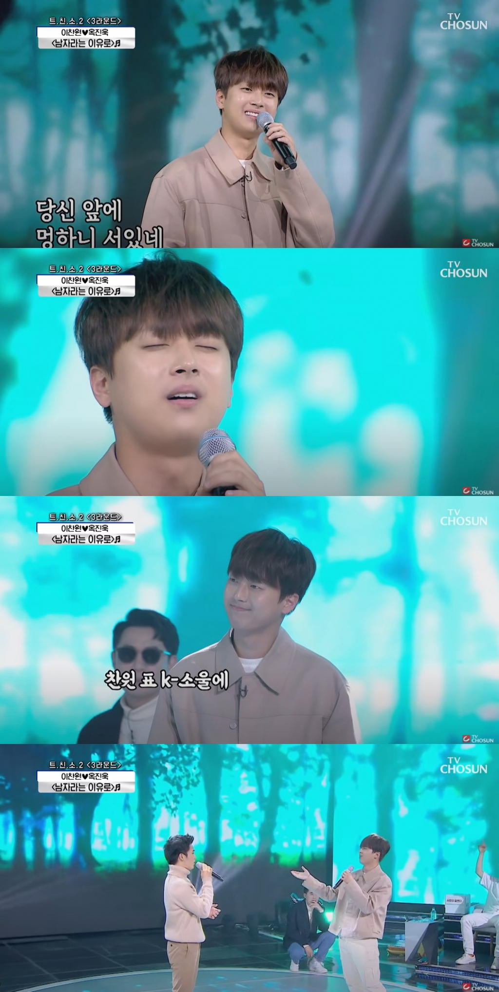 영상에는 TV조선 '사랑의 콜센타'에서 이찬원이 절친 옥진욱과 함께 듀엣으로 선보인 '남자라는 이유로' 무대가 담겼다.