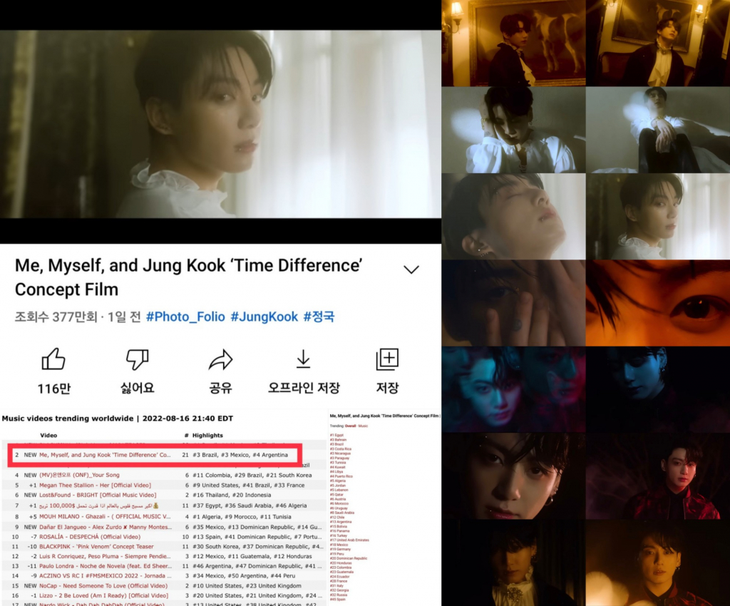 방탄소년단 공식 유튜브 채널 '방탄TV'를 통해 공개된 'Me, Myself, and Jung Kook 'Time Difference ' 콘셉트 필름' 영상은 유튜브 전 세계 뮤직 비디오 트렌딩 2위에 올랐으며, 37개국에서 트렌딩됐다.