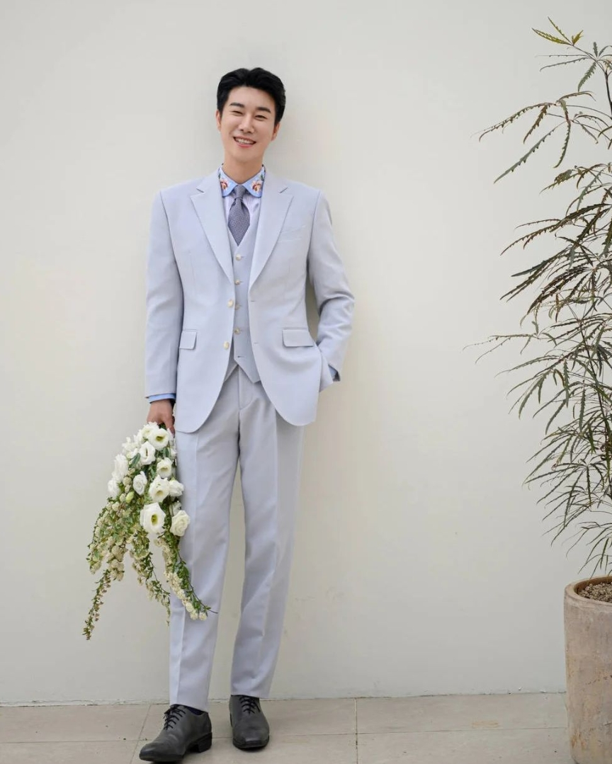 공개된 사진에는 꽃을 들고 서 있는 산이의 모습이 담겨 있다. 산이는 하늘빛 정장을 차려 입고 환한 미소로 예비 신랑의 기쁨을 표현했다.