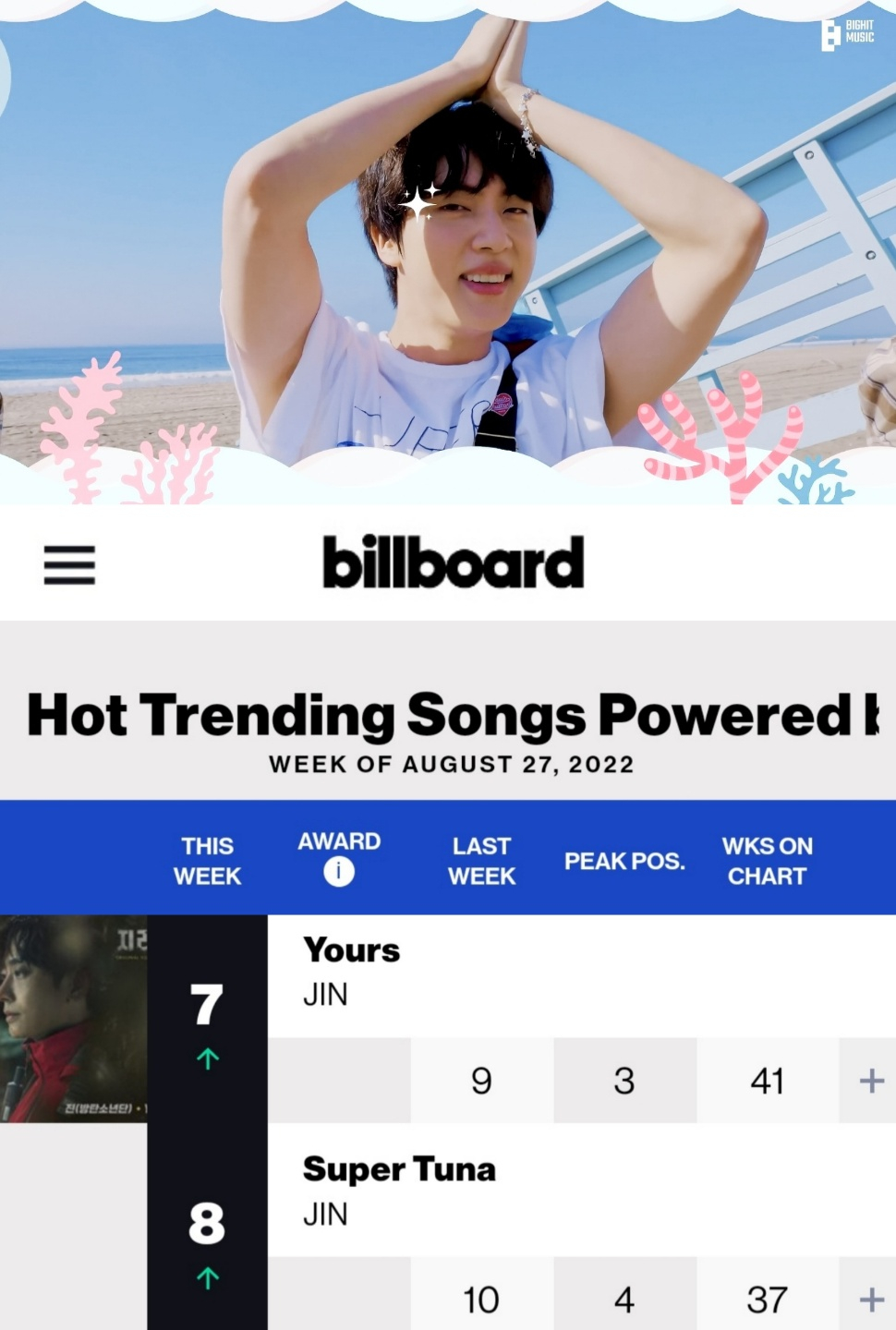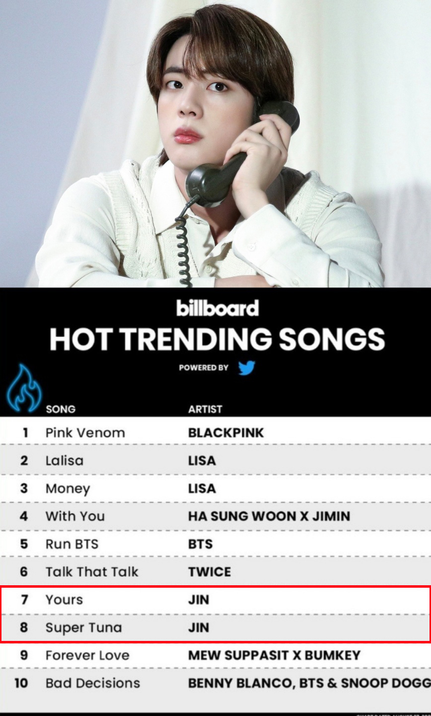 진의 솔로곡 'Yours'와 '슈퍼 참치'는 8월 24일 빌보드 차트가 발표한 '핫 트렌딩 송즈 주간 차트' (Billboard Hot Trending Songs Chart-weekly/8월 27일 자)에서 각각 7위와 8위에 올랐다. 진은 이로써 역대 솔로 아티스트 최초로 37주 연속 솔로 2곡을 차트 인하는 대기록을 세웠다.