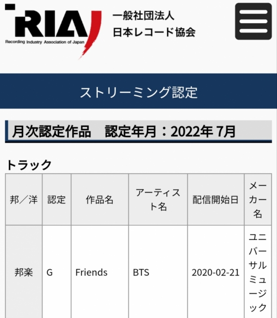 일본 레코드 협회에서는 발매 개시일부터의 누계 스트림 수에 따라 '실버'(3000만 달성), '골드'(5000만 달성), '플래티넘'(1억 달성) 등으로 인증하고 있으며 지민의 '친구'는 2022년 7월 5000만 스트리밍을 돌파해 방탄소년단 유닛곡 최초 '골드' 인증의 쾌거를 이룬 것이다.