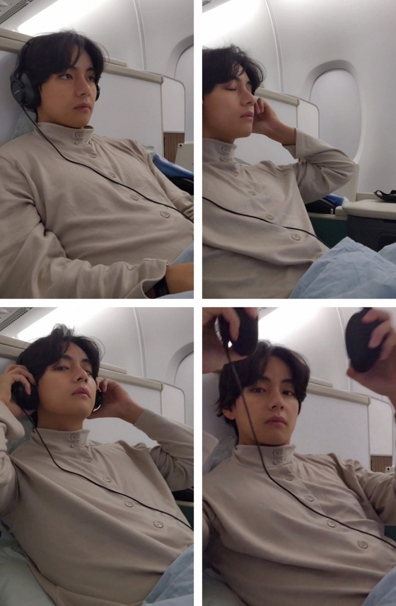 영상에서 뷔는 비행기 내에서 편한 잠옷으로 갈아입고 헤드폰을 쓰고 음악을 듣고 있었다. 민낯임에도 완벽한 뷔의 미모는 감탄을 자아내게 했다.