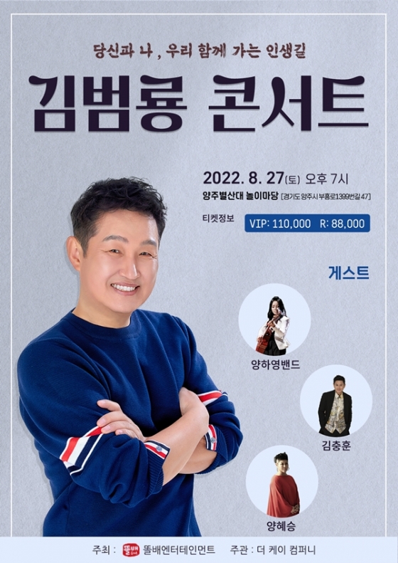 공연을 앞둔 김범룡은 "어떤 힘든 상황에서도 웃고 희망을 나누는 우리의 인생길에 늘 여러분의 힘이 되고 함께 가고 싶다. 많은 대중들에게 노래로 희망과 행복을 전하고자 한다"고 전했다.