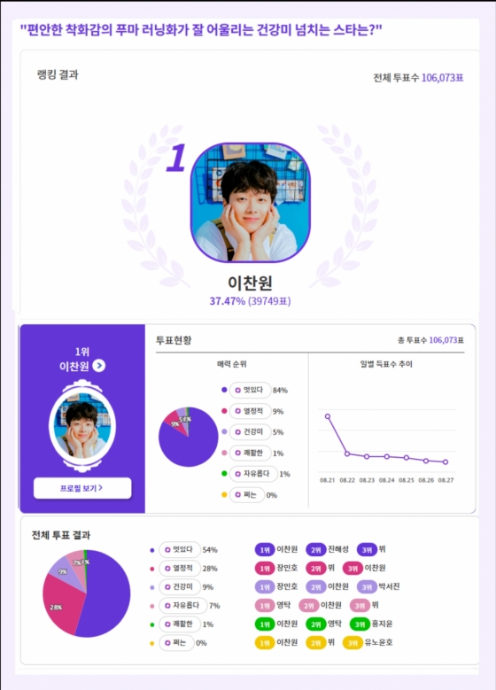 이찬원은 8월 21일부터 8월 27일까지 익사이팅 디시에서 진행된 '편안한 착화감의 푸마 러닝화가 잘 어울리는 건강미 넘치는 스타는?' 설문에서 1위를 차지했다.