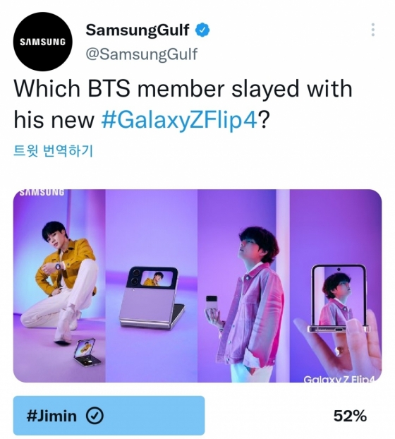 지민은 삼성걸프(SamsungGulf)가 최근 공식 트위터를 통해 진행한 "Which BTS member slayed with his new #GalaxyZFlip4?" 투표에서 총 8만 87명 중 52%의 지지를 받으며 소비자들로부터 '갤럭시Z플립4'를 대표하는 모델로 강렬한 존재감을 각인시켰다.