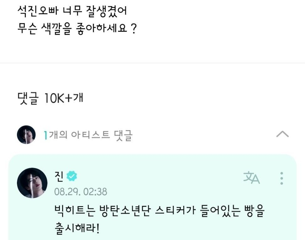 팬들은 "얼굴도 두뇌도 천재 석지니", "기획력 대박 왕똑또기 왕귀염둥이", "팬사랑꾼 또 왔어. 너무 행복해", "방탄 빵? 그거 좋은데? 빅히트 진행시켜!", "새벽에 왕귀염둥이 석진이 왔다갔어. 진짜 좋음", "방탄빵 난리난다ㅋㅋㅋ", "귀여운 석진이 댓글보고 자서 행복했다", "역시 아이디어뱅크야. 진이 단 댓글들 다 귀엽네ㅋㅋ" 등 뜨거운 반응을 나타냈다.
