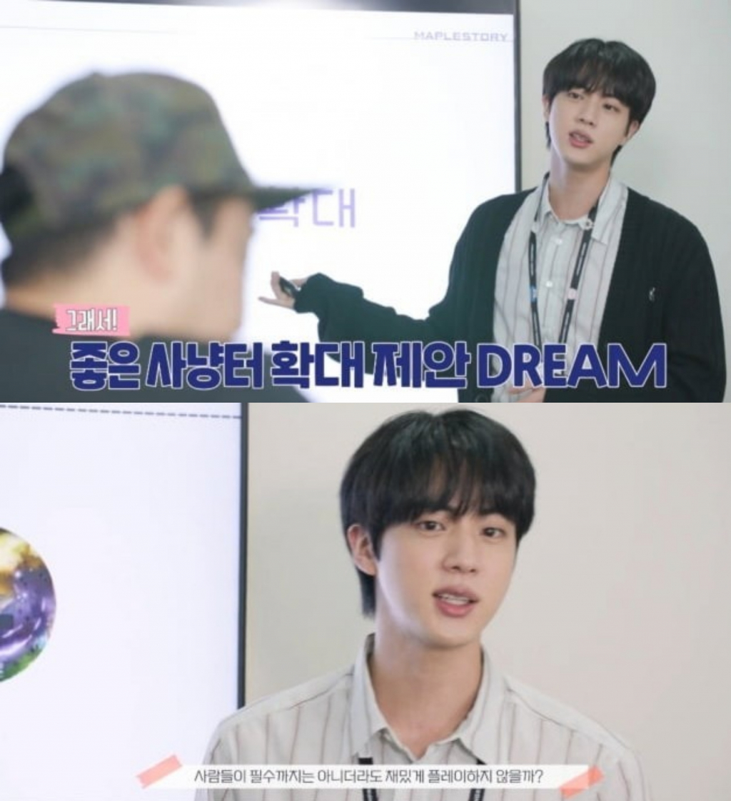 이는 메이플 스토리 추석 업데이트 '이그니션 풀 문 파티' 등을 말하는 것으로 진은 '출근용사 김석진' 유튜브 영상을 통해 넥슨 본사에서 눈부신 비주얼과 반짝이는 아이디어로 PPT 발표를 하는 모습을 보여준 바 있다.