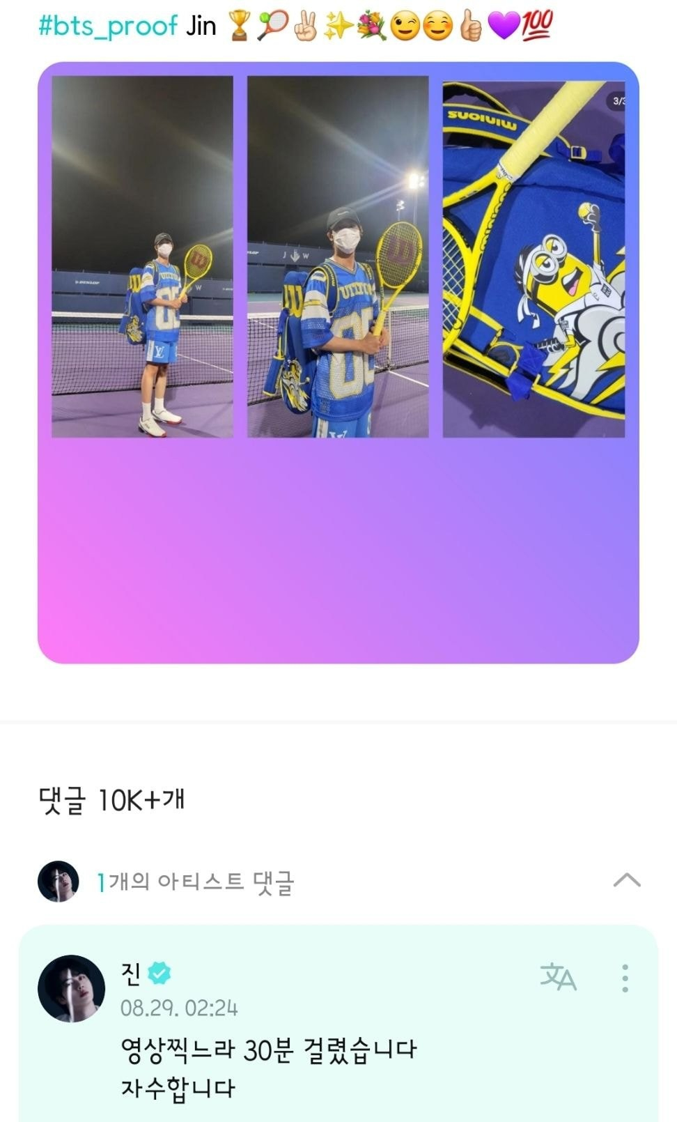 또 다른 팬이 테니스 라켓을 들고 있는 진의 사진과 함께 꽃다발과 트로피, 엄지, 보라색 하트, 100점 이모티콘으로 애정을 표현한 게시글에는 "영상 찍느라 30분 걸렸습니다. 자수합니다"라는 귀여운 댓글로 팬들의 얼굴에 웃음을 띠게 했다.