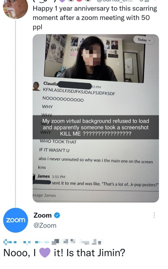 사진에는 1년 전 줌 회의 시 가상 배경 화면이 제대로 작동되지 않아 자신의 방과 얼굴이 그대로 공개되었고 스크린샷이 찍혀 난처했다는 내용이 적혀있었으며 방 벽면에 방탄소년단과 지민의 사진이 가득 걸려있었다.