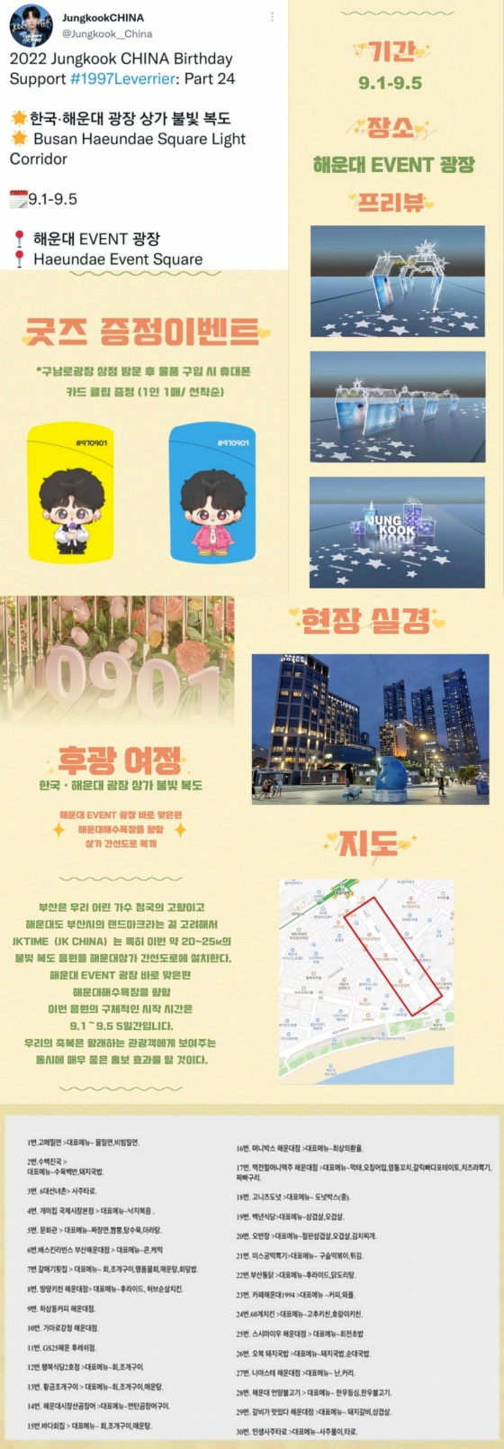 '정국 차이나'의 '불빛 도로' 서포트는 정국의 생일인 9월 1일부터 9월 5일까지 5일간 해운대역 방면에서 해운대 이벤트 광장과 해수욕장을 잇는 구남로 상가 거리에서 펼쳐진다.