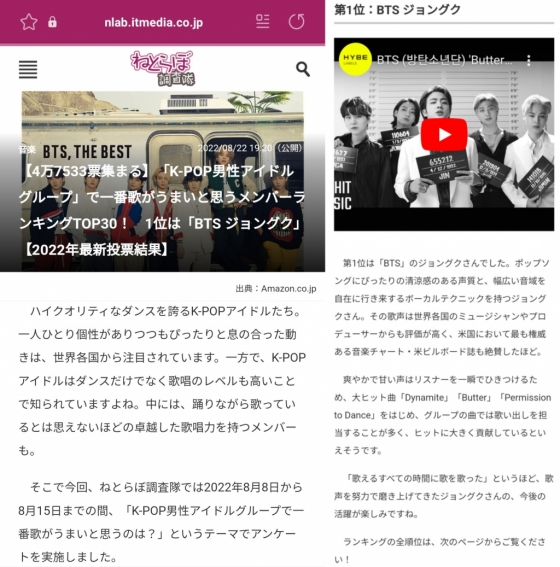 일본 매체 'nlab.itmedia'는 일본 트렌드 정보 사이트 네토라보 조사대에서 8월 8일부터 8월 15일까지 'K팝 남자 아이돌 그룹에서 가장 노래를 잘한다고 생각하는 가수'라는 테마로 설문 조사를 실시했고, 정국이 1위를 차지했다고 전했다.