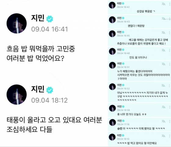 이에 '지민 덕분에 월요병도 두렵지않아', '날씨 요정 지민 오빠도 태풍 조심해요', '자기라고 하지마 너무 설레니까♡', '다음엔 라이브하면서 같이 저녁 먹자', '인도음식 한마디에 난리났어~ 화제성 대박' 등 팬들의 뜨거운 호응이 이어졌다.