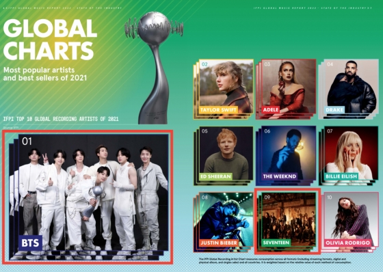 국제음반산업협회(IFPI)가 발표한 통계자료에 따르면 방탄소년단은 2021년 IFPI Global Recording Artist of the Year Award에서 1위에 오르며 2년 연속 정상의 위치에 섰다. 방탄소년단은 2018년에는 2위에 올랐고 2019년에는 7위였다. 이미 여러 차례 언급됐지만 방탄소년단의 글로벌 위상은 여전히 어마어마한 수준이다.
