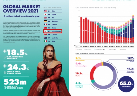 역시 IFPI가 발표한 뮤직 글로벌 마켓 순위에서 대한민국은 미국 일본 영국 독일 프랑스 중국에 이어 7위를 기록했다. 반면 The World's favorite genres 2021년도 순위에서 K팝의 이름은 포함되지 않았다. (1위 팝 2위 록 3위 90년대 음악 4위 80년대 음악 5위 사운드트랙 6위 힙합 랩 트랩 7위 R&B 8위 댄스 일렉트로닉 하우스 9위 70년대 음악 10위 소울 블루스) IFPI는 이에 더해 팬덤이 강한 일부 국가들의 세부 장르를 조명하면서 올해도 K트로트에 주목하는 모습을 보였다.