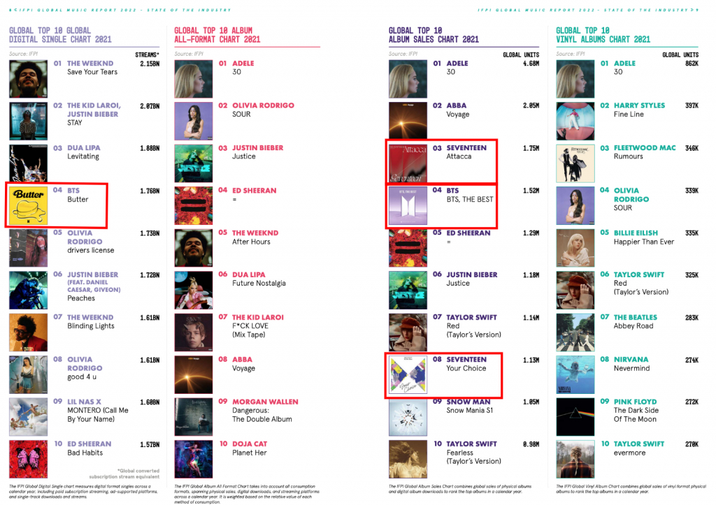 IFPI가 공개한 디지털 싱글, 앨범 차트에서도 방탄소년단은 'Butter'로 디지털 앨범 차트 4위, 'BTS, THE BEST'로 앨범 세일즈 차트 4위를 차지했으며 세븐틴은 'Attacca'로 3위, 'Your Choice'로 앨범 세일즈 차트 9위에 자리하며 방탄소년단보다 더 좋은 성과를 내기도 했다.