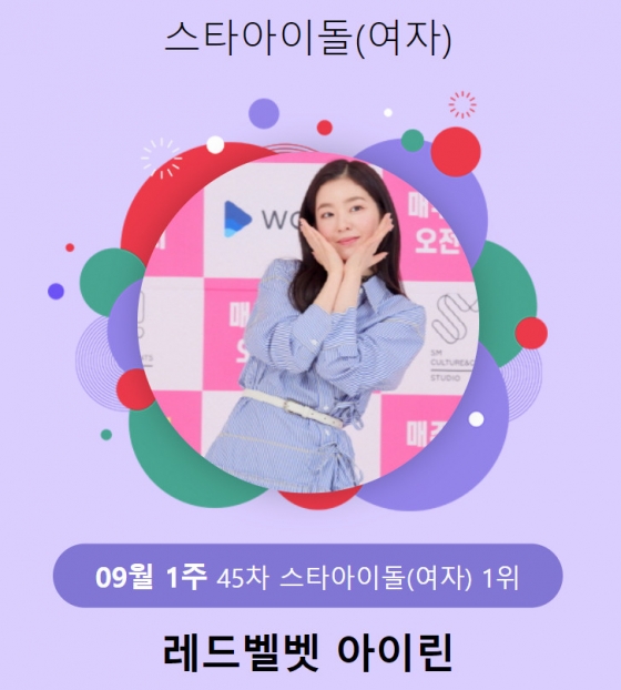 그룹 레드벨벳 멤버 아이린이 스타랭킹 여자 아이돌 부문에서 1위에 올랐다.