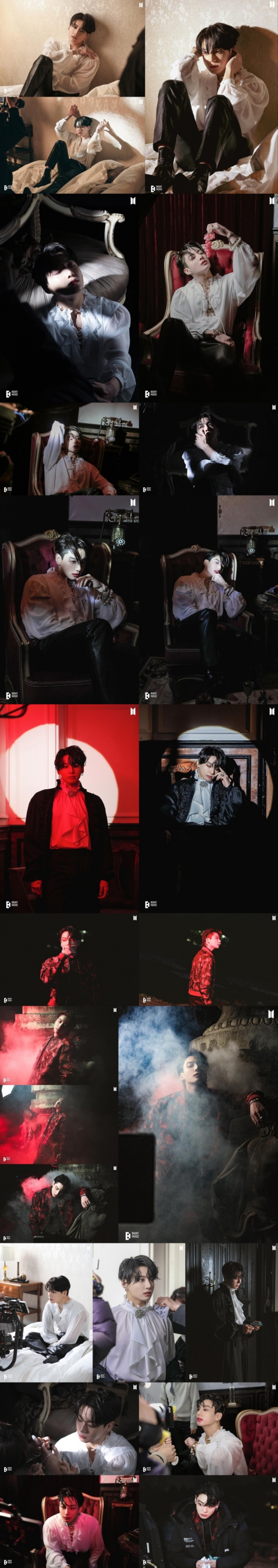 특히 번진 입술과 냉혈한 카리스마로 뱀파이어의 숨은 본능과 갈망을 디테일하게 표했다. 이어 레이스가 돋보이는 블랙 재킷을 입은 정국은 뱀파이어 본연으로 완전히 흑화된 아우라를 발산했다. 투블럭 헤어 스타일을 한 정국은 화려한 레드 재킷을 입고 마치 현대판 뱀파이어의 매력도 드러냈다.