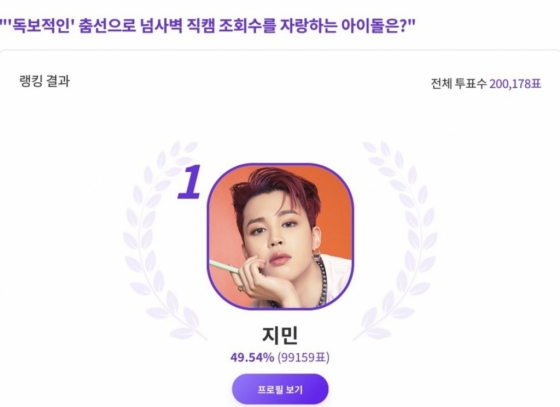 방탄소년단(BTS) 지민이 '독보적인 춤선으로 넘사벽 직캠 조회수를 자랑하는 아이돌' 1위에 선정됐다.