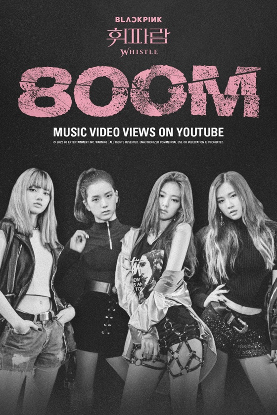 그룹 블랙핑크(지수 제니 로제 리사)의 데뷔곡 '휘파람' 뮤직비디오가 유튜브에서 8억뷰를 돌파했다.