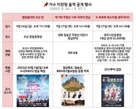 이찬원은 다음 날인 9월 17일 오후 1시 청송 주왕산 대전사에서 열리는 '제7회 주왕산 시와 국악의 만남' 음악회에도 참여할 예정이다.
