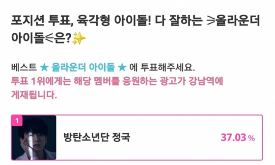한편, 정국은 'STARPLAY'(스타플레이)에서 지난 1월에 진행한 '최고의 육각형 남자 아이돌' 투표에서도 1위에 오른 바 있어 '육각형 아이돌' 2관왕의 영예를 안았다.