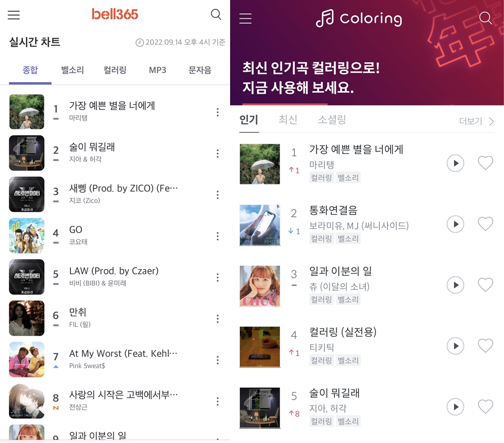 특히 벨365 톱10에는 지아&허각의 '술이 뭐길래', 지코의 '새삥', 아이브의 'After Like' 코요태의 'GO', 비비의 'LAW', 임영웅의 '무지개' 등 대중적으로 큰 인기를 얻고 있는 가수들의 음원이 이름을 올린 가운데, 마리탱의 '가장 예쁜 별을 너에게'가 가장 높은 순위를 기록해 의미를 더했다.