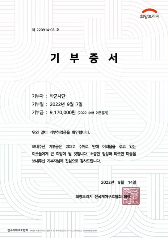박군은 "항상 사회의 도움이 필요한 상황이 발생할 때마다 따뜻한 마음으로 기부에 참여해 주시는 '박군사단' 분들께 감사드린다. 보금자리를 잃고 힘든 시기를 겪고 계실 수재민들께서도 하루빨리 평온한 일상으로 돌아갈 수 있기를 바란다"고 전했다.