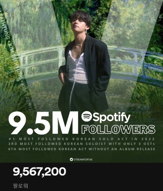 방탄소년단 뷔가 세계 최대 음원 플랫폼 스포티파이(spotify) 팔로워 950만 명을 돌파하며 솔로아티스트로서 존재감을 빛냈다.
