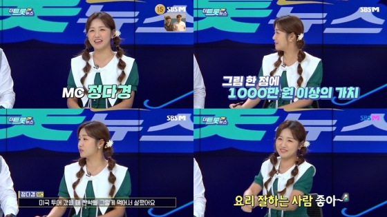 정다경은 지난 19일 오후 방송된 SBS FiL, SBS M '더트롯 연예뉴스'에 출연했다. 정다경은 2주간의 '트롯계 핫이슈'를 전하는가 하면, 높은 '텐션'으로 시청자들과 함께했다.