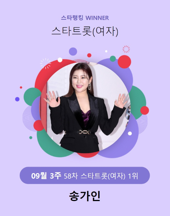 송가인은 9월 15일 오후 3시 1분부터 9월 22일 오후 3시까지 진행된 9월 3주(58차) 스타랭킹 스타트롯 여자 랭킹 투표에서 1위에 등극했다. 58주 연속 1위로 변함없는 인기를 입증했다.