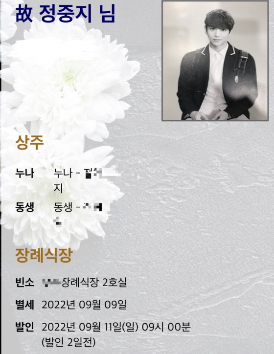 모친은 "지금 기분은 뭐라 이루 말할 수 없다"며 애통한 심경을 전하며 고 정중지의 영정을 공개했다. 발인은 지난 11일 엄수됐다.
