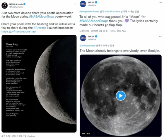 나사(NASA)는 최근 달 유인 착륙 및 탐사 프로젝트 '나사 아르테미스' 공식 트위터 계정을 통해 #NASAMoonSnap 해시태그와 함께 달을 주제로 한 시적 감상 글을 올려달라는 캠페인을 진행했다.