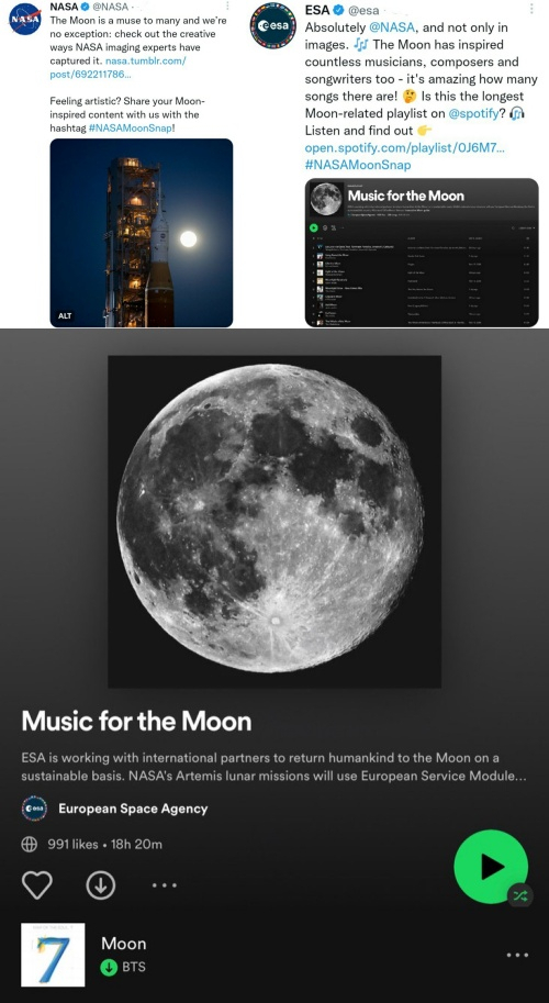 지난 8월 유럽우주기구(European Space Agency, 이하 ESA) 또한 'Music for the Moon' 플레이리스트에 진의 자작곡인 'Moon'을 추가하며 진의 강력한 존재감을 입증하기도 했다.