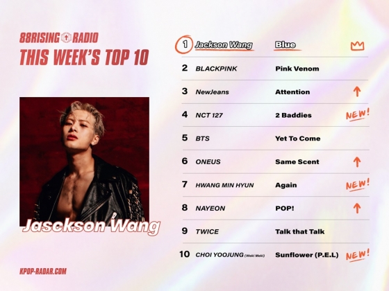 그룹 갓세븐 출신 솔로 잭슨이 미국 전역으로 방송되는 케이팝 전용 차트쇼 '케이팝레이더 (K-POP RADAR)'의 위클리 팬덤 차트에서 1위를 차지했다.
