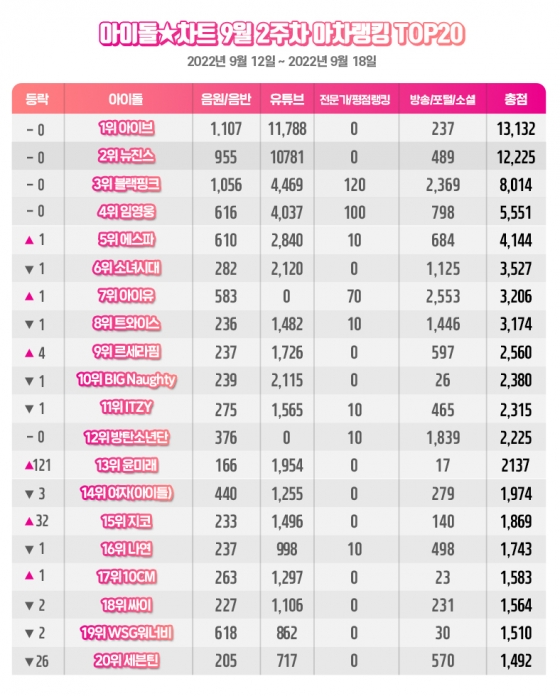 아이브는 24일 발표된 아이돌차트 9월 2주차(22.9.12~22.9.18) 아차랭킹에서 음원점수 1107점, 유튜브 점수 1만 1788점, 소셜점수 237점 등 총점 1만 3132점으로 1위를 기록했다.
