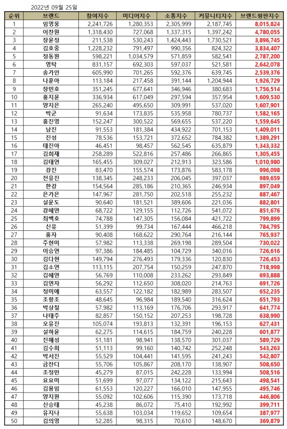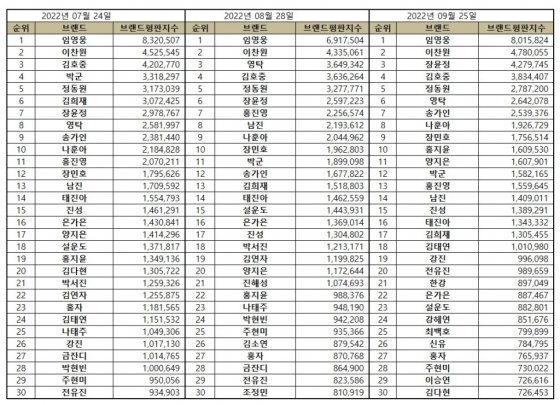 2022년 9월 트로트 가수 브랜드평판 30위 순위는 임영웅, 이찬원, 장윤정, 김호중, 정동원, 영탁, 송가인, 나훈아, 장민호, 홍지윤, 양지은, 박군, 홍진영, 남진, 진성, 태진아, 김희재, 김태연, 강진, 전유진, 한강, 은가은, 설운도, 강혜연, 최백호, 신유, 홍자, 주현미, 이승연, 김다현 순으로 분석됐다.