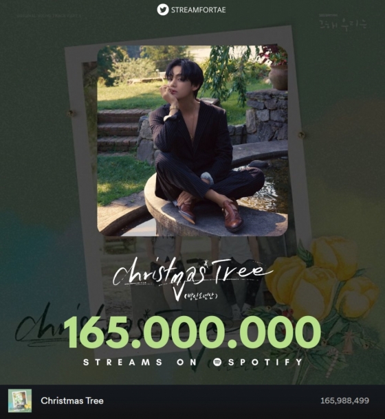 방탄소년단(BTS) 뷔의 'Christmas Tree'가 스포티파이에서 한국 OST 사상 최단기간에 1억6500만 스트리밍을 돌파하며 뜨거운 인기를 자랑했다.