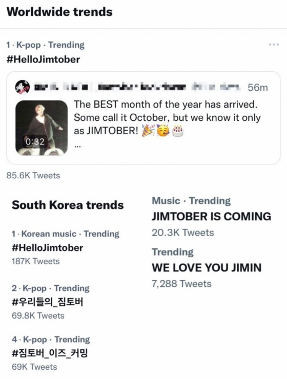 지난 1일 지민의 생일 기간인 '짐토버(Jimin+October)' 축제의 시작을 기념한 전 세계 팬들의 메시지 해시태그 '#HelloJimtober'가 월드와이드와 대한민국 실시간트렌드 1위에 등극했다.