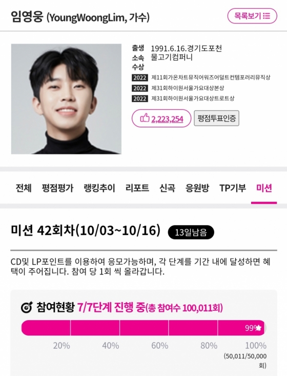 가수 임영웅 팬클럽 영웅시대가 아이돌차트 미션을 단 13분만에 7단계까지 달성하며 막강 팬화력을 보여줬다.