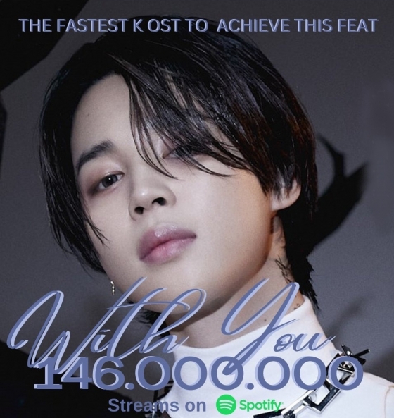 지민의 'With You'는 지난 2일 세계 최대 음원 플랫폼 스포티파이(Spotify)에서 1억 4600만 스트리밍을 돌파해 발매 160일 10시간 만에 한국 OST 사상 최단 기간 스포티파이 신기록을 재경신했다.