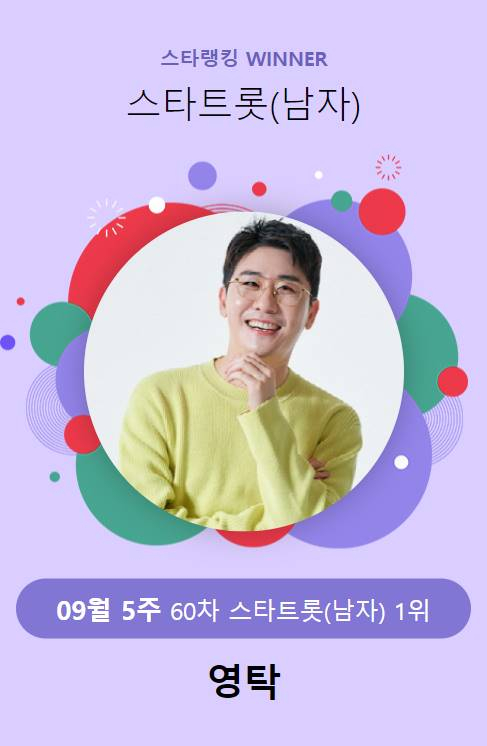영탁은 9월 29일 오후 3시 1분부터 10월 6일 오후 3시까지 진행된 9월 5주(60차) 스타랭킹 스타트롯 남자 랭킹 투표에서 14만 6453표를 획득하고 1위의 왕좌를 꿰찼다.