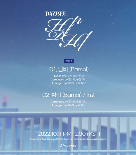 다즈비의 소속사 액셀러즈는 지난 6일 공식 SNS 채널에 싱글 '밤비' 발매 기대감을 높여줄 2차 티저 이미지를 공개했다. 공개된 이미지는 곡 제목에 걸맞게 밤하늘을 올려다보는 듯한 일러스트로 다즈비 특유의 청량하고 맑은 감성을 극대화 시켜주며 싱글 앨범 '밤비'에 대한 기대를 더욱 높인다.