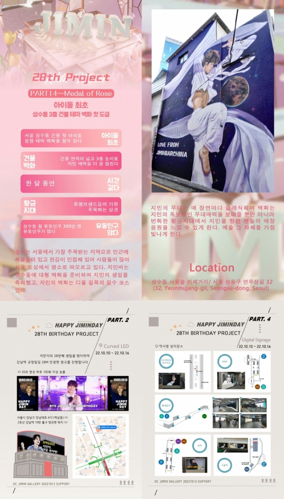 지민의 중국 팬베이스 '지민바차이나'(JIMINBAR_CHINA)는 지민의 생일을 축하하며 핫 플레이스로 각광받고 있는 서울 성수동 3층 건물 벽면 전체에 '지민 벽화'를 조성했다.