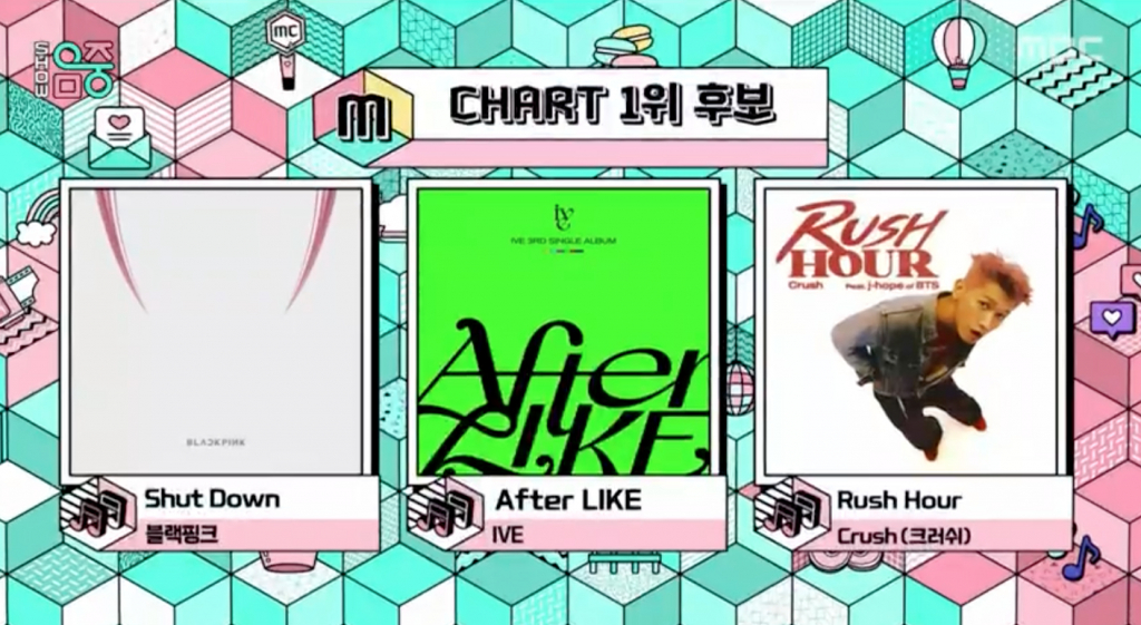 이날 블랙핑크는 'Shut Down', 아이브는 'After LIKE', 크러쉬는 'Rush Hour'로 1위에 도전한다.