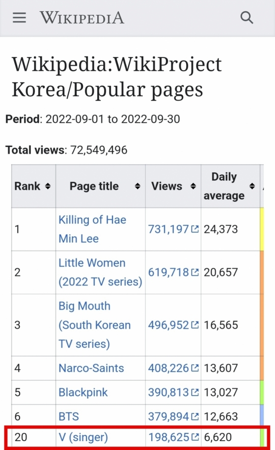 뷔는 9월 위키피디아 한국 프로젝트 페이지(영문판) 공식랭킹에서 총 페이지뷰 19만회를 기록하며 한국 남자 연예인 개인 1위에 올랐다.